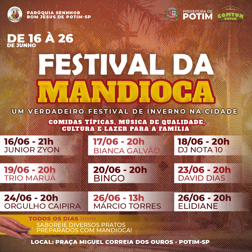 Nesta quinta-feira, 16 de junho, começa o Festival da Mandioca de Potim. O evento acontecerá na Praça da Matriz Bom Jesus de Potim, a partir das 20h. A iniciativa faz parte da Festa do Divino e tem como objetivo, resgatar a cultura do cultivo e consumo do vegetal na cidade.